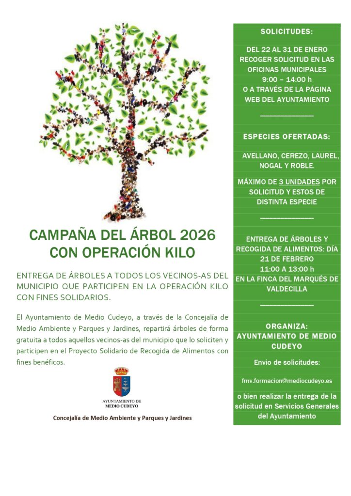El Ayuntamiento de Medio Cudeyo, a través de la Concejalía de Medio Ambiente y Parques y jardines, repartirá árboles de forma gratuita a todos aquellos-as, vecinos-as del municipio que lo soliciten y participen en la campaña solidaria de recogida de alimentos.
