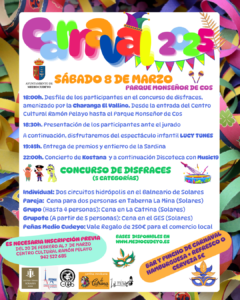 🎭 18:00h. Desfile de los participantes en el concurso de disfraces, amenizado por la Charanga El Vallino. Desde la entrada del Centro Cultural Ramón Pelayo hasta el Parque Monseñor de Cos. Es necesaria inscripción previa para participar.