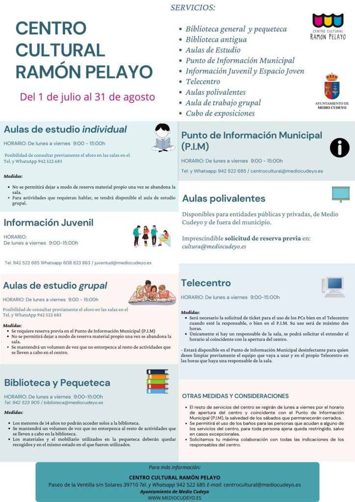Como en años anteriores, durante los meses de julio y agosto el Centro Cultural Ramón Pelayo y todos sus servicios cambian de horario durante la época estival.