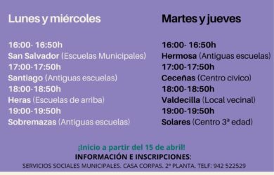 Lunes y miércoles 16:00-16:50 h, San Salvador (Escuelas Municipales) 17:00-17:50 h. Santiago (Antiguas escuelas) 18:18:50 h. Heras (Escuelas